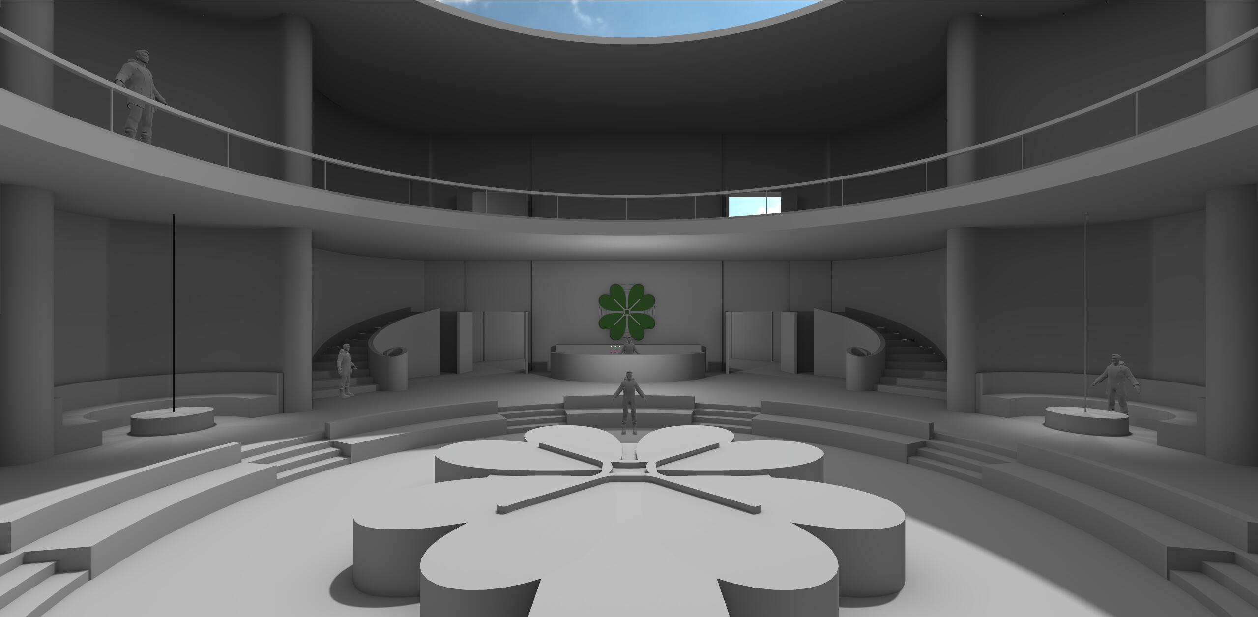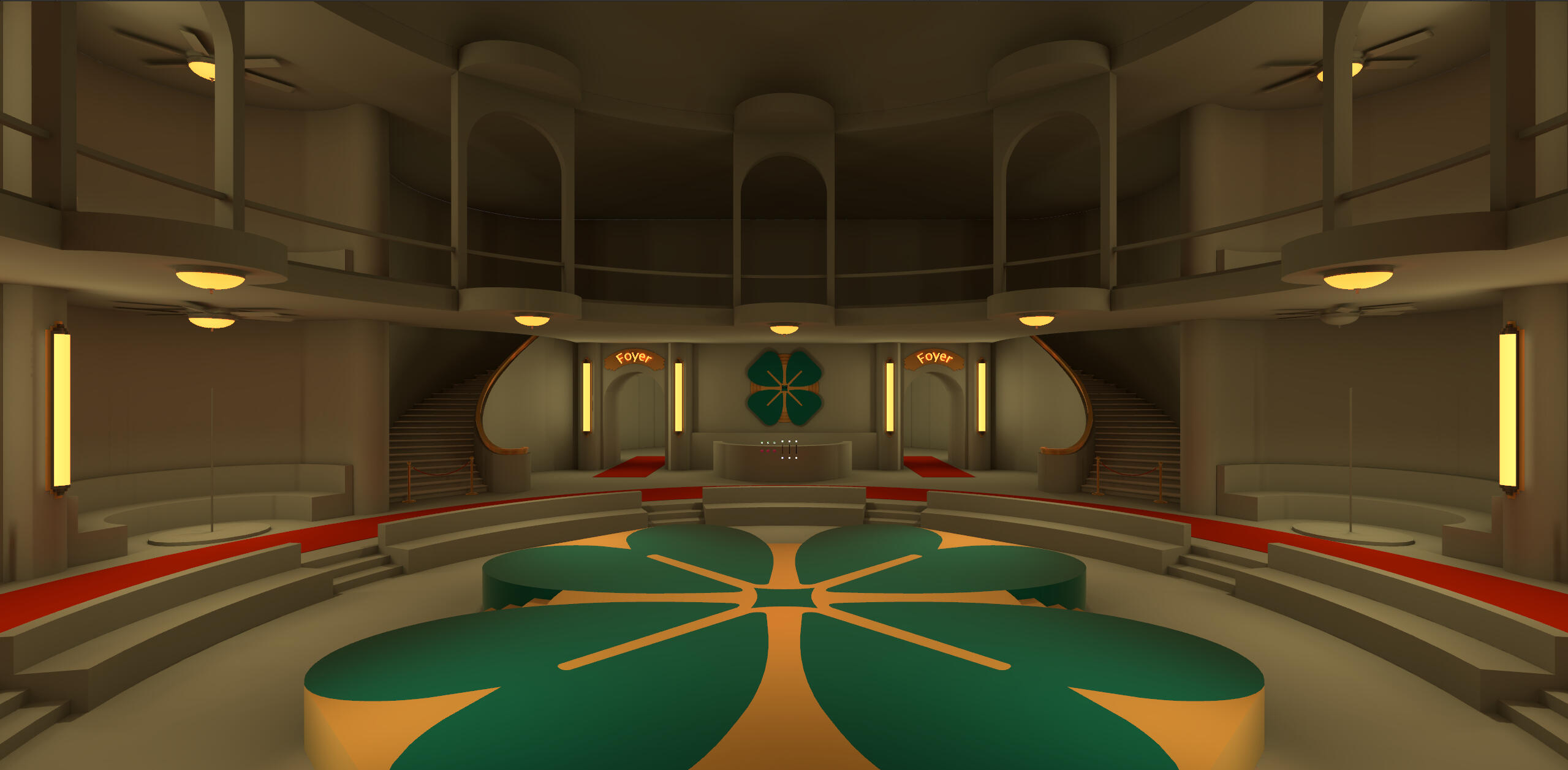 | In this second iteration, I began to introduce a preliminary color palette and initial lighting passes. Setting the lighting early in the process is crucial for me, as it allows to define the mood and "read" the environment's depth. This helped us visualize the direction of the atmosphere and ensured the Art Deco theme was translating correctly from concept to 3D space. |