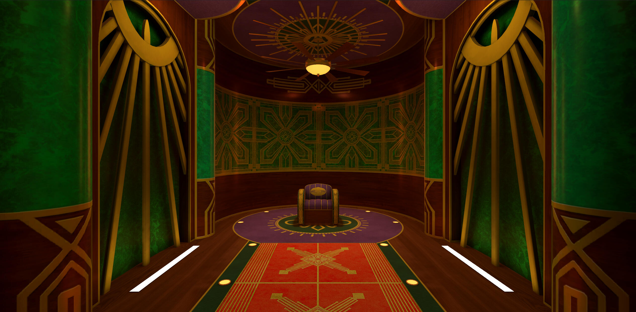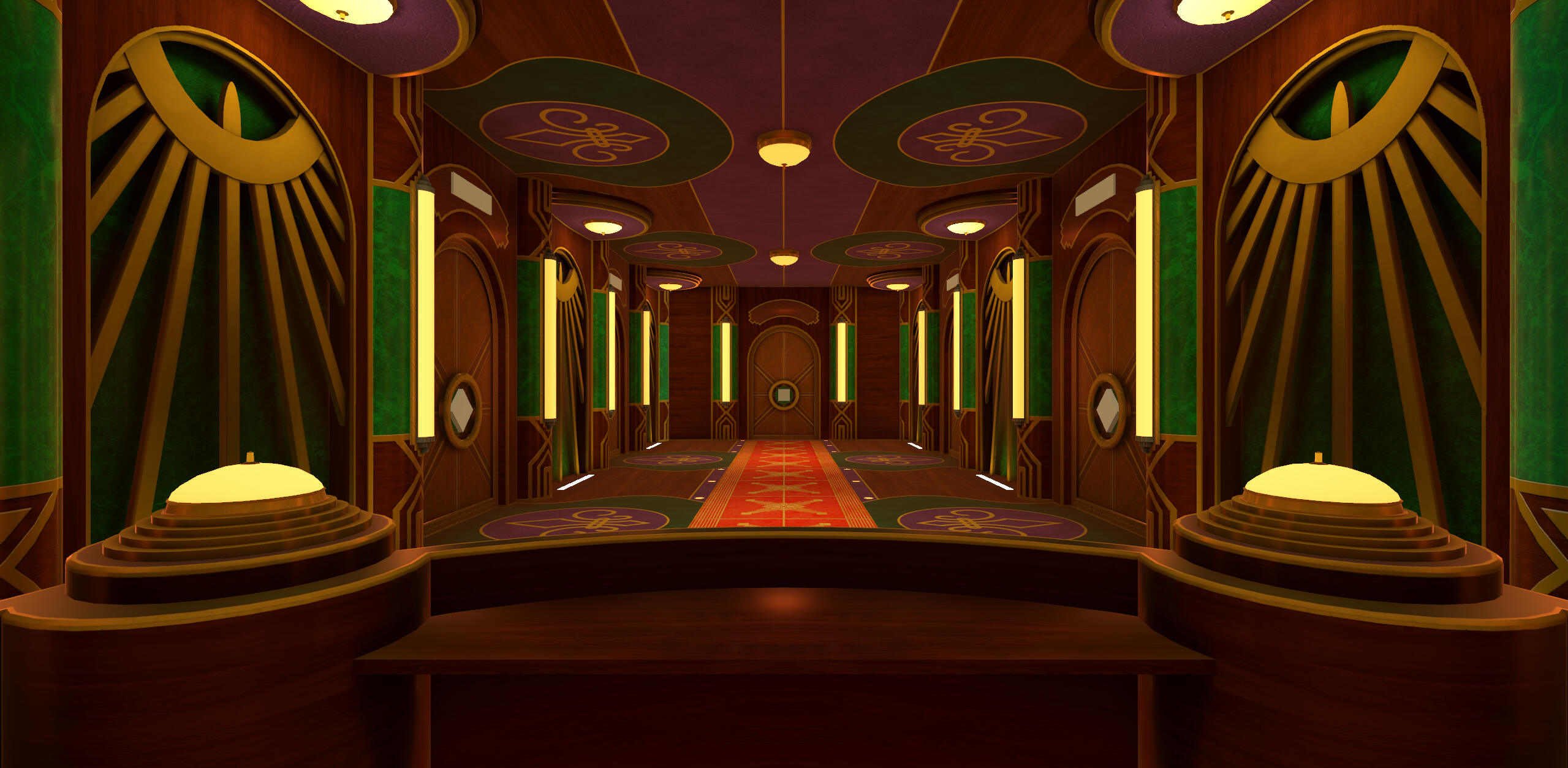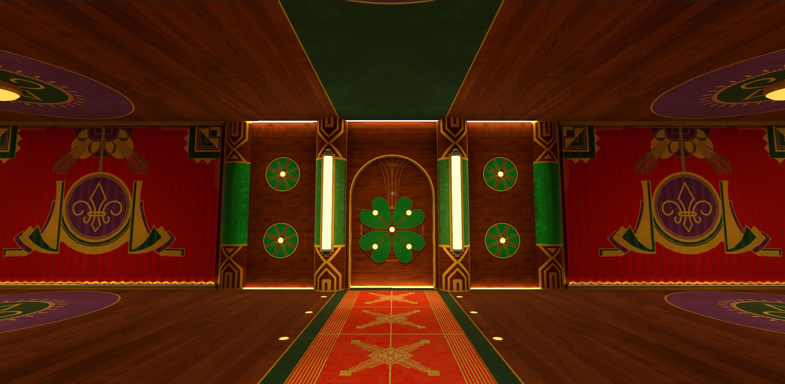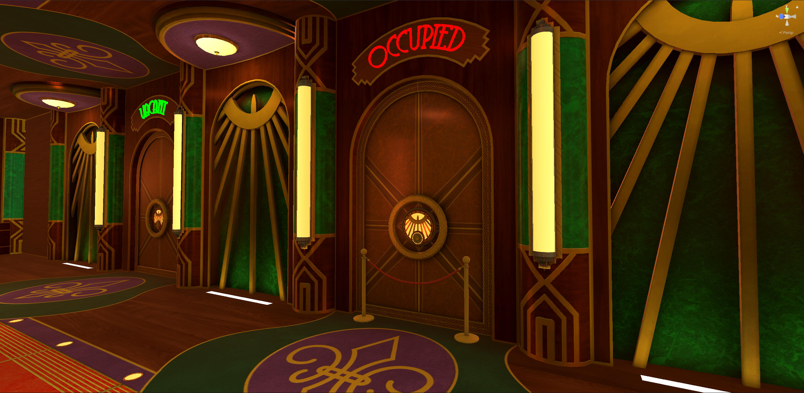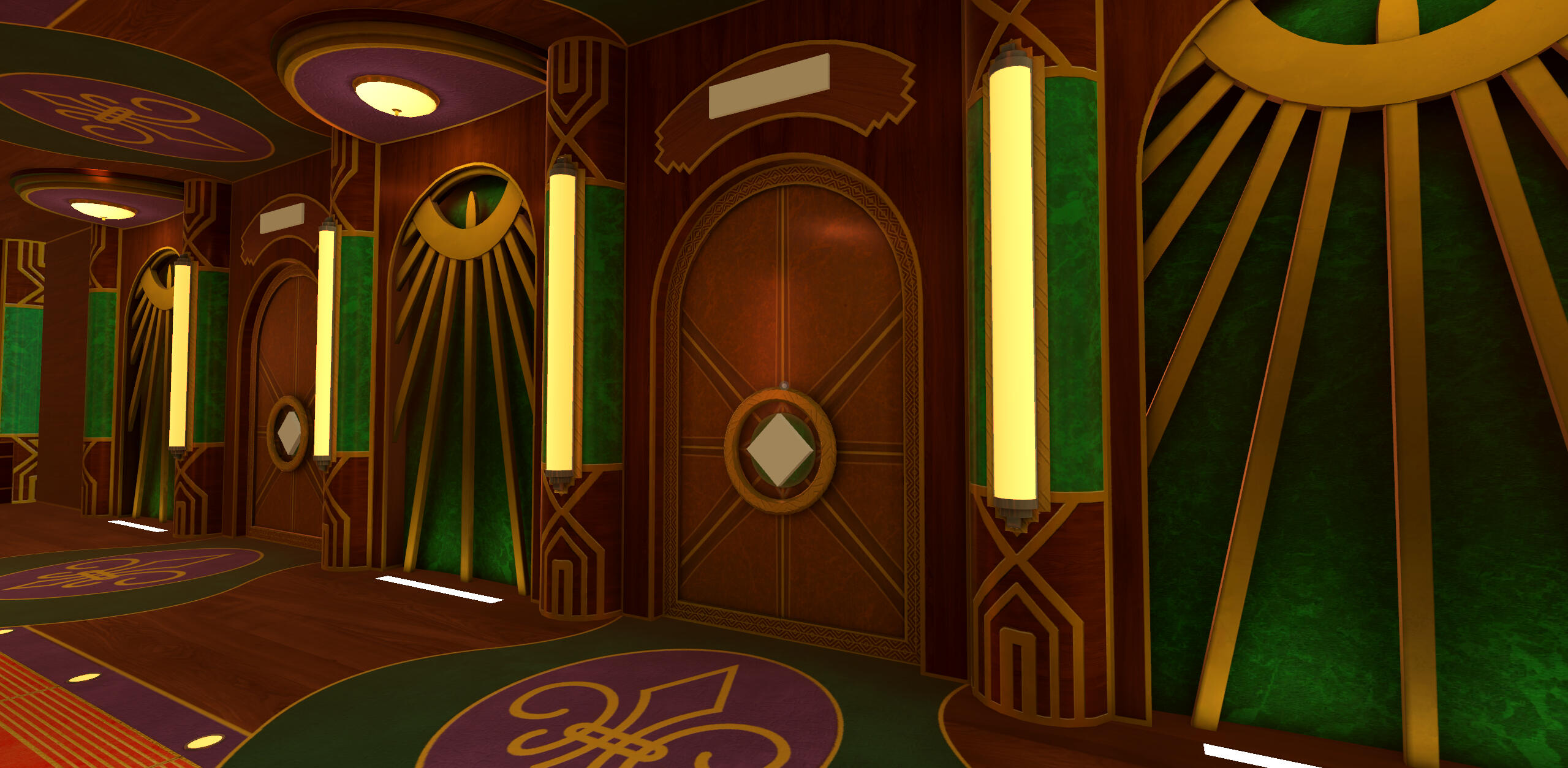 | I began introducing more complex elements, such as custom carpet symbol guides. This wasn't just an aesthetic choice, it was a functional design move to help guide guests through the space naturally. During this time, I also conducted further lighting experiments, fine-tuning how the light interacted with new material surfaces to ensure the Art Deco accents remained the focal point. This phase is all about pushing those "extra" ideas that transform a static room into an immersive experience. |